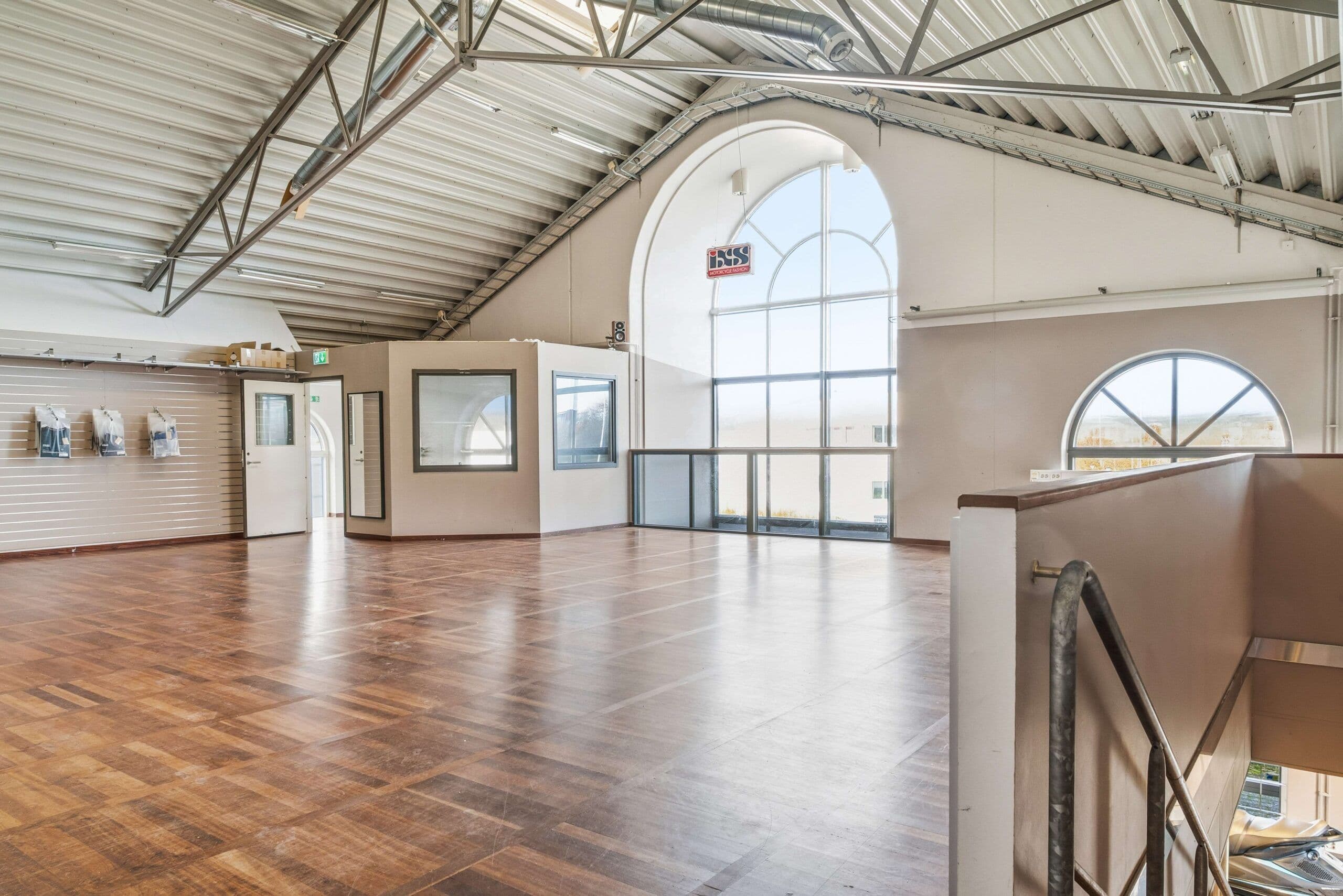 Den högre delen av lokalen har en imponerande takhöjd om cirka 5,5–7 meter och nås smidigt via två portar (3,5 × 4 meter), vilket ger goda förutsättningar för logistik och större flöden. Ett entresolplan skapar dessutom extra yta för förvaring eller kompletterande användning.
